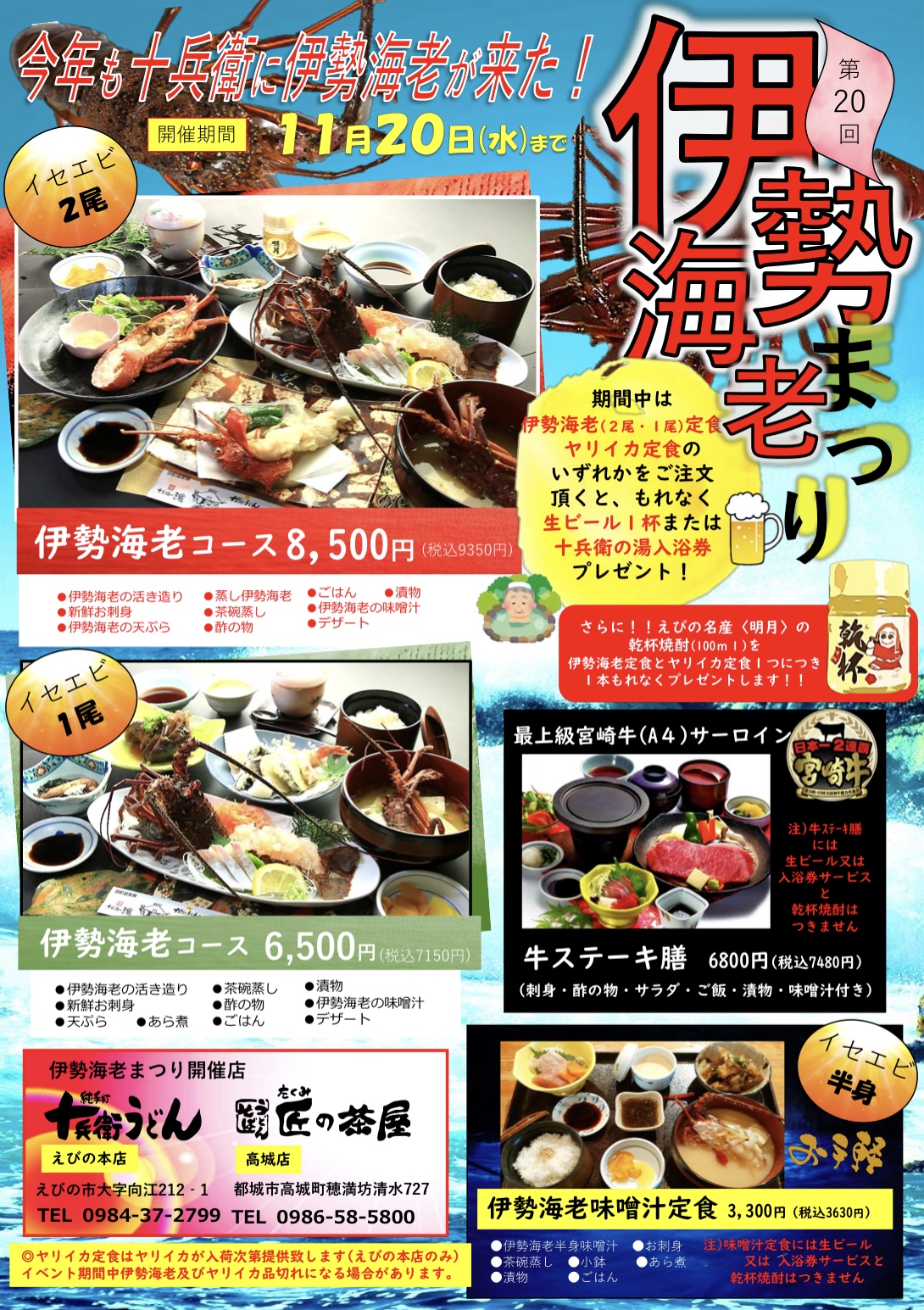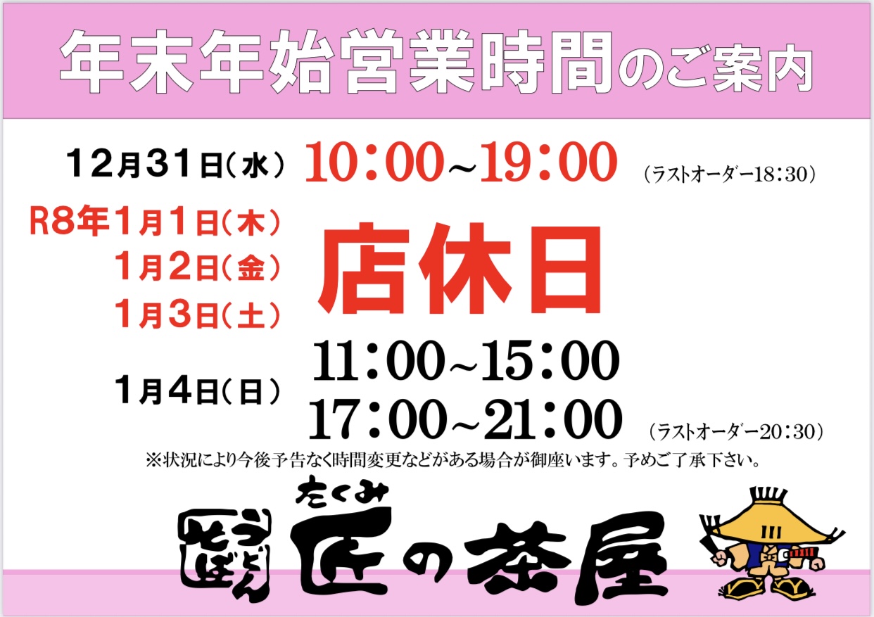 年末年始の営業時間のお知らせです。十兵衛うどん京町本店、匠の茶屋十兵衛高城店、とんかつ十兵衛宮崎店は1日.2日とお休み致します。