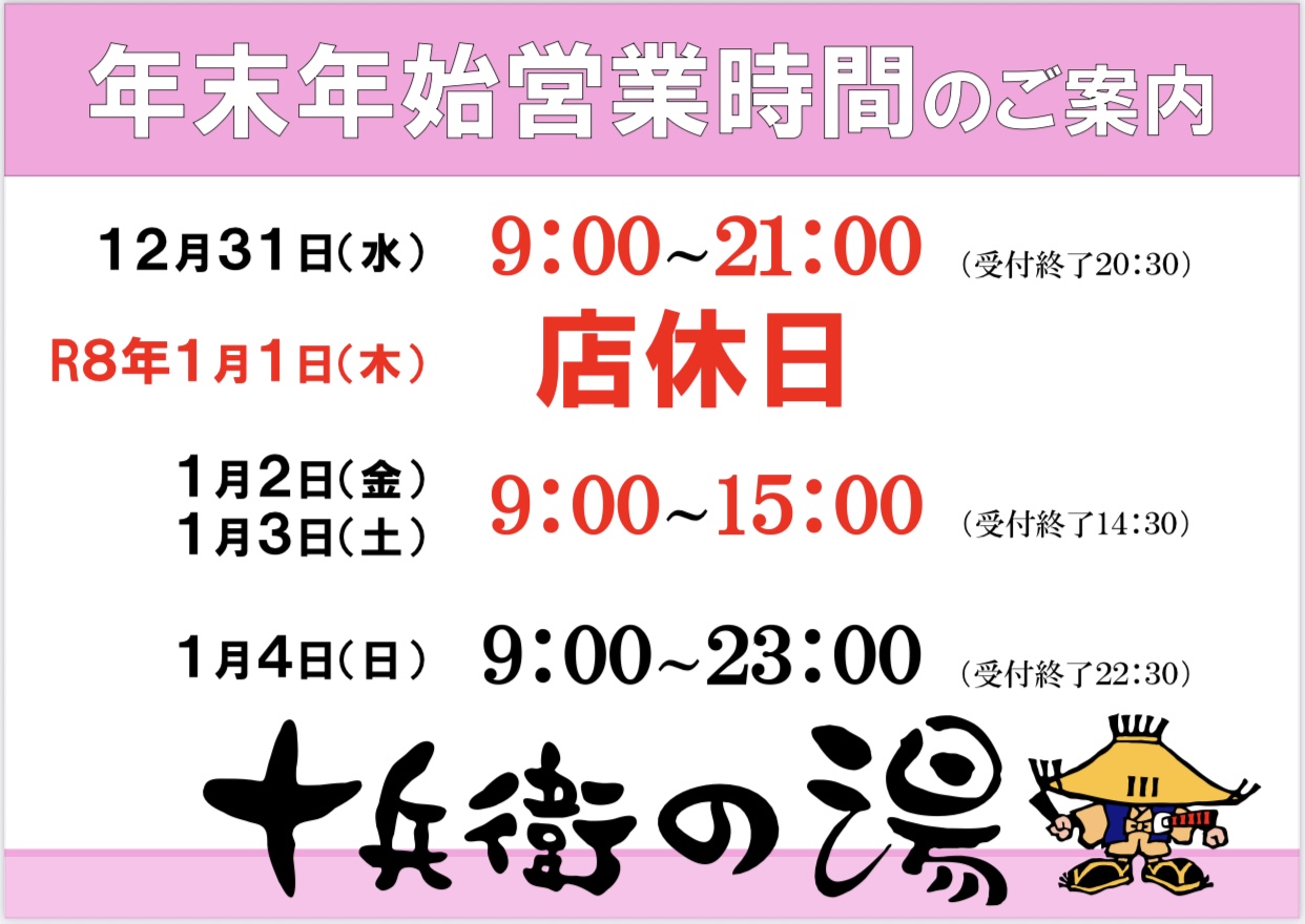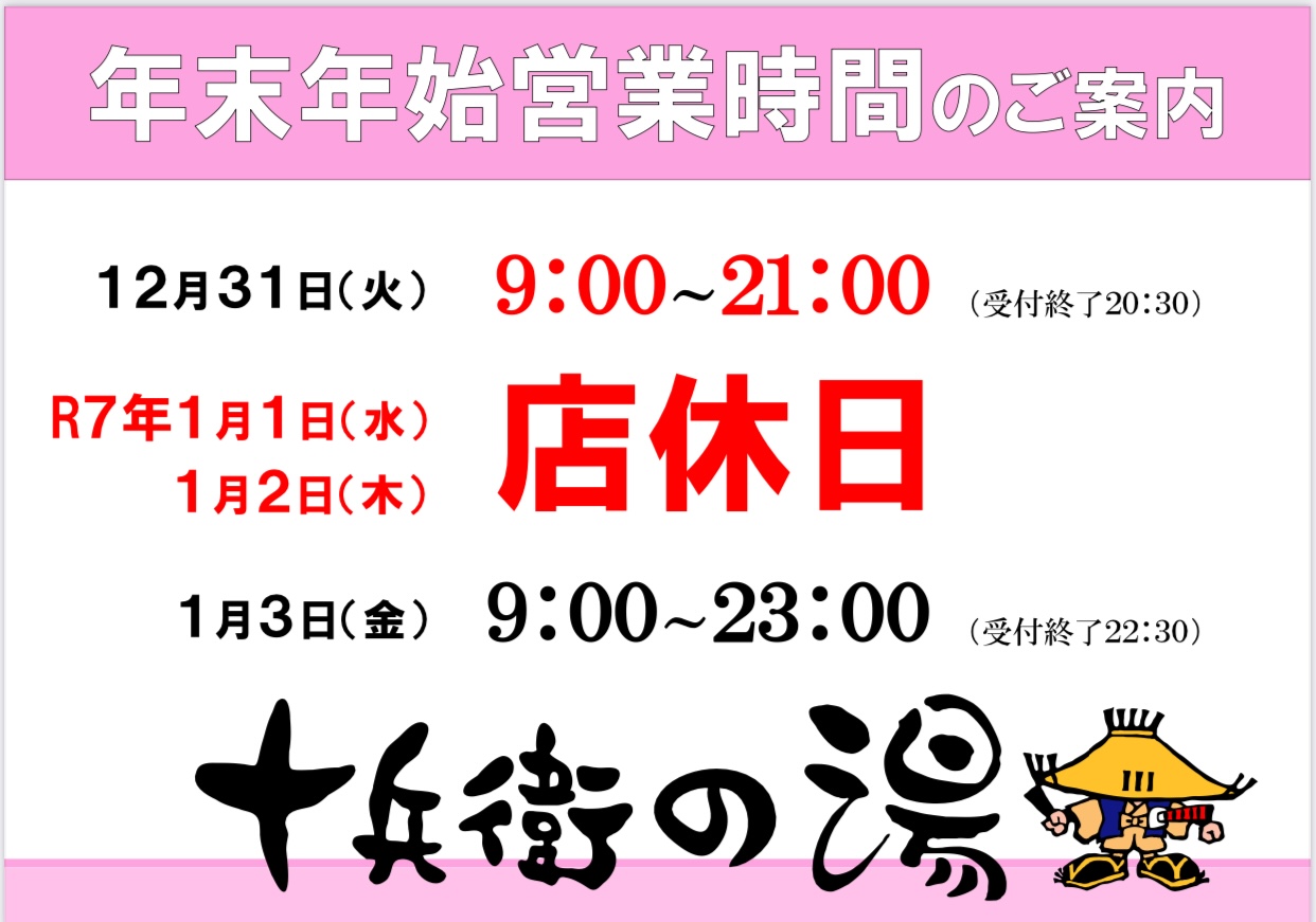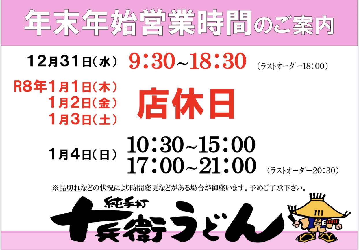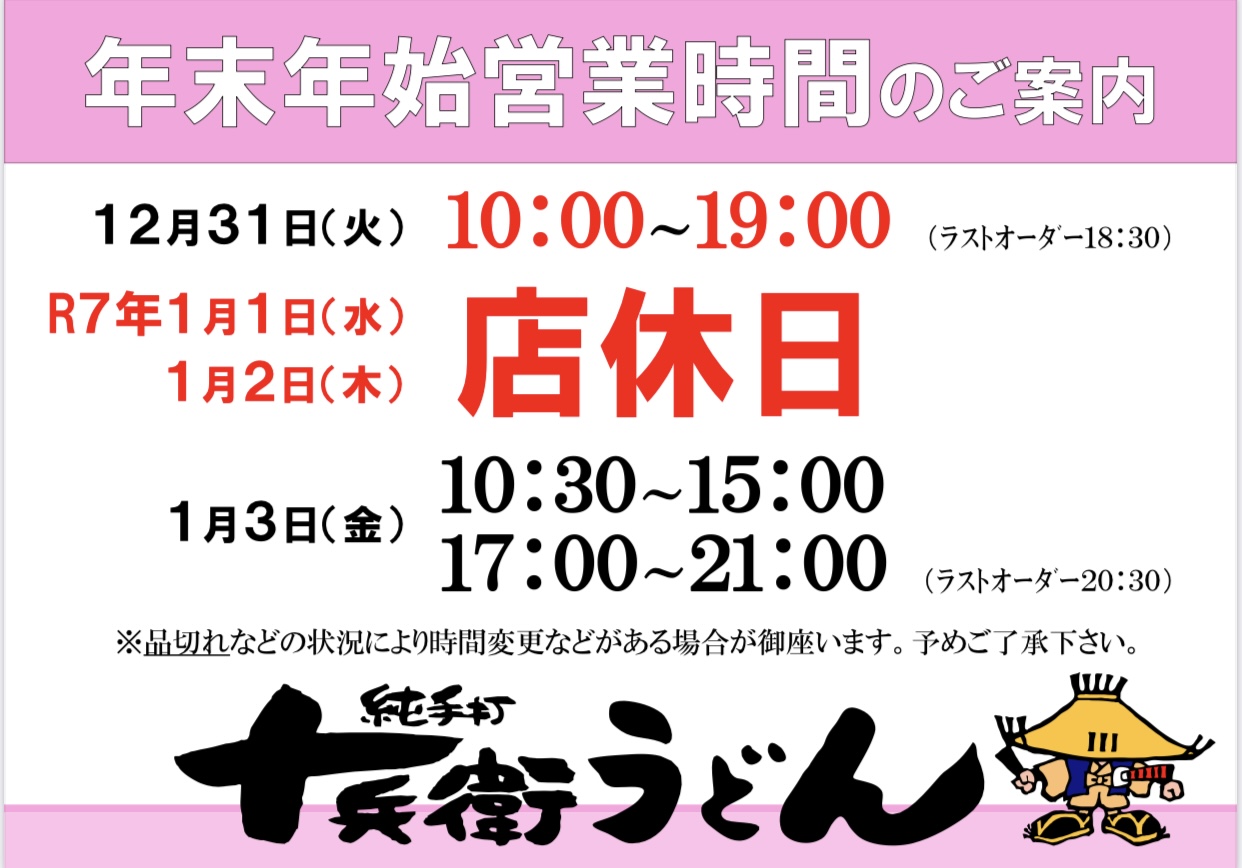 日頃より十兵衛グループをご利用いただき誠に有難う御座います。年末年始営業時間のお知らせです。